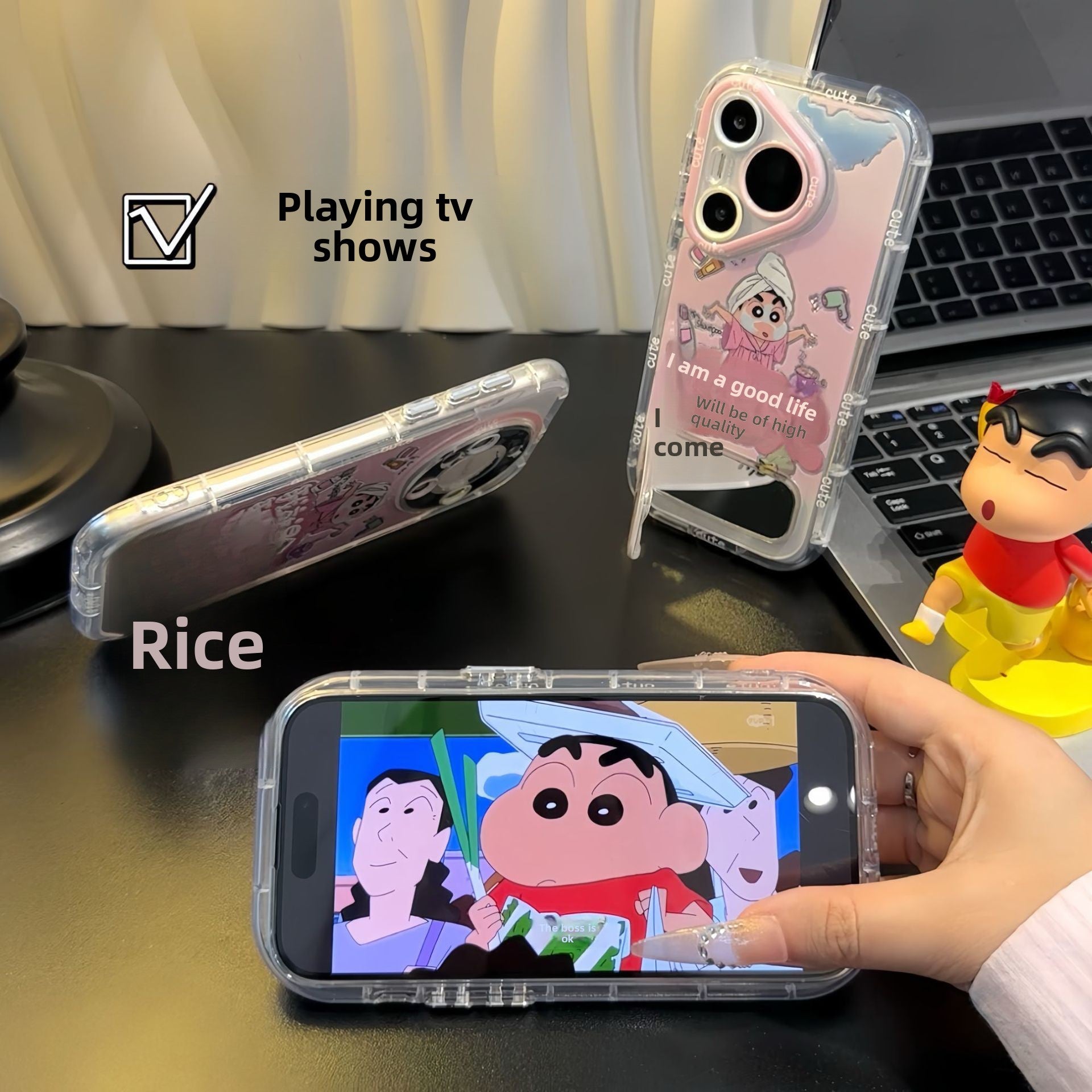 Cute Crayon Shin - chan phone case! Clear cover with pink gradient, featuring Shin - chan in a bathrobe. Has a mirror stand—works as a holder for watching shows or reading. Compatible with multiple models. Fun, practical, and full of charm. A must - have for fans!