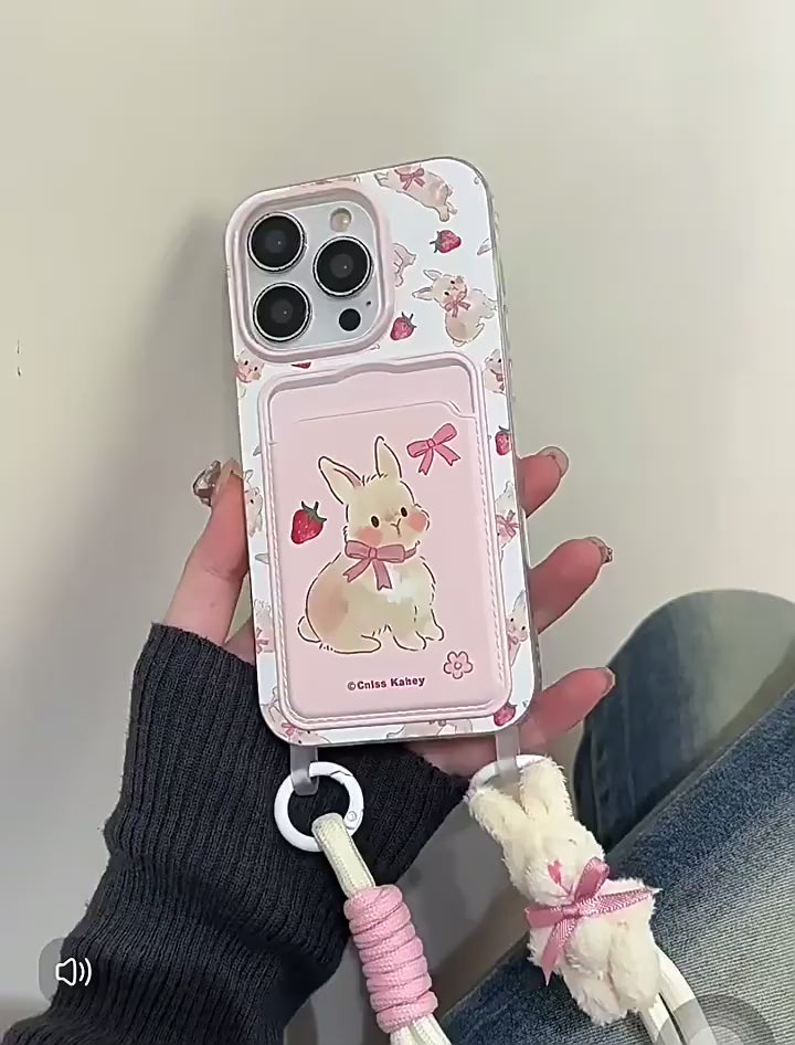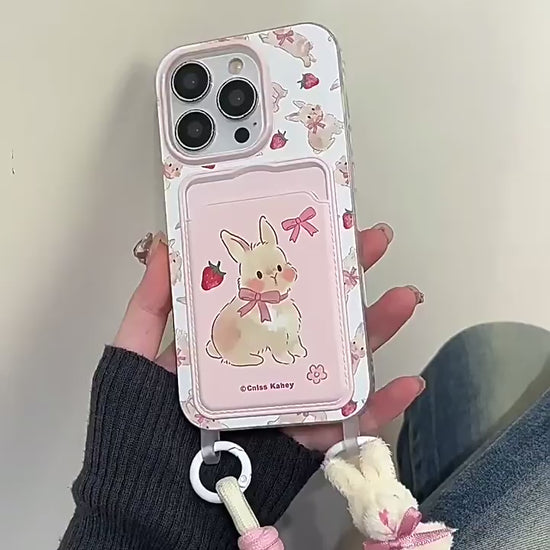 Fall in love with this super - cute phone case! It has adorable bunnies with pink bows and strawberries all over. There's a handy card slot and a sweet plush bunny charm on the strap. Perfect for adding a touch of pink, playful charm to your phone. Protects your device and looks oh - so - lovely!